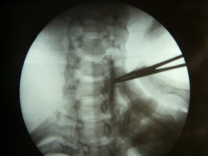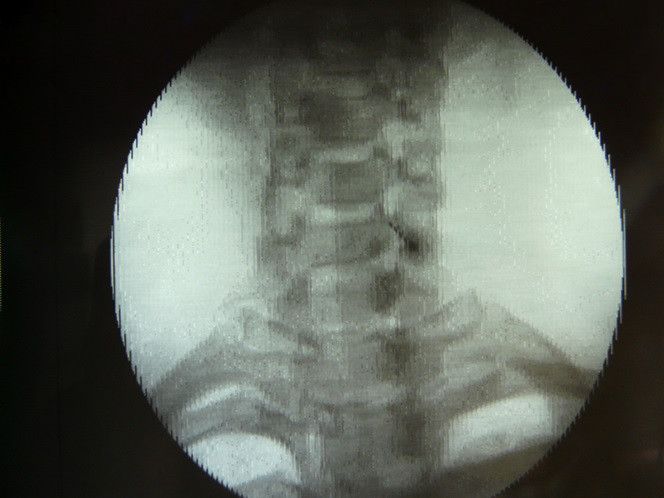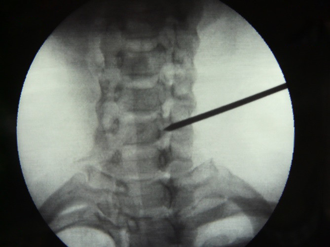 El haz del rayo del fluoroscopio se dirige en proyección AP hasta que el disco de C5-C6 es visualizado, esto se logra mediante una angulacion craneocaudal del brazo del intensificador de imagen, en tiempo real se realiza la infiltración de piel y se introduce una aguja espinal calibre 25 hasta que haga contacto con la unión del proceso unciforme y el cuerpo vertebral, se administra 2 ml de medio de contraste para visualizar el musculo largo del cuello (Longus Collí).