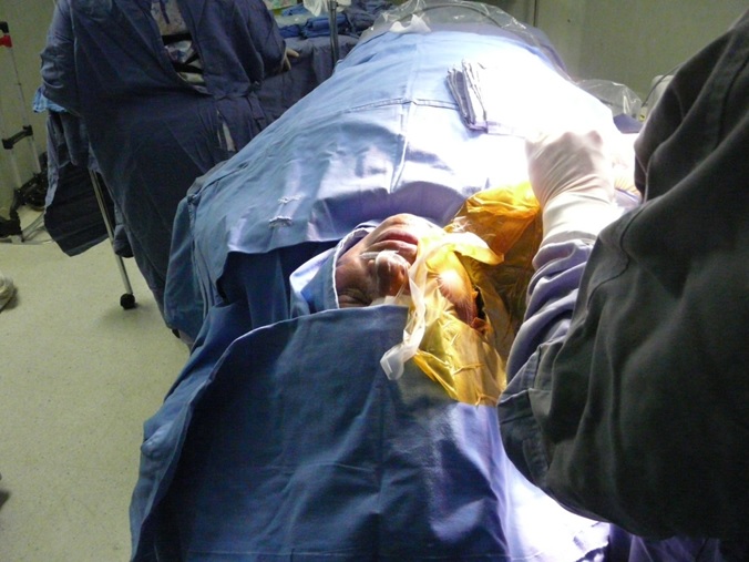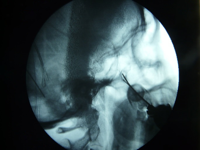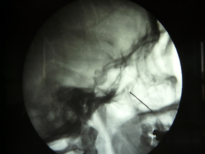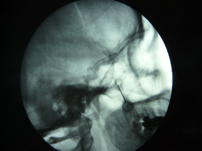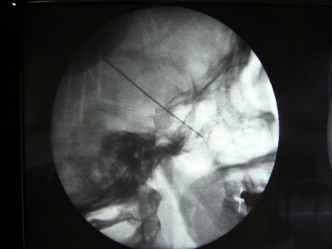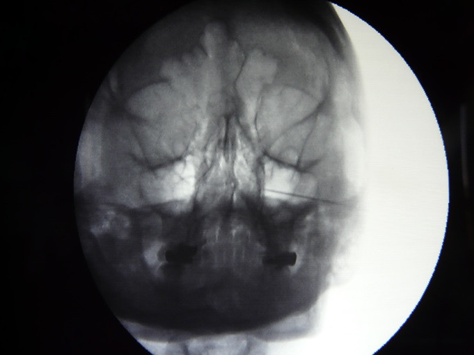 Fig.7. Introduccción de la aguja hasta la fosa Ptrigopalatina bajo control fluoroscopico en tiempo real con abordaje infra cigomático.