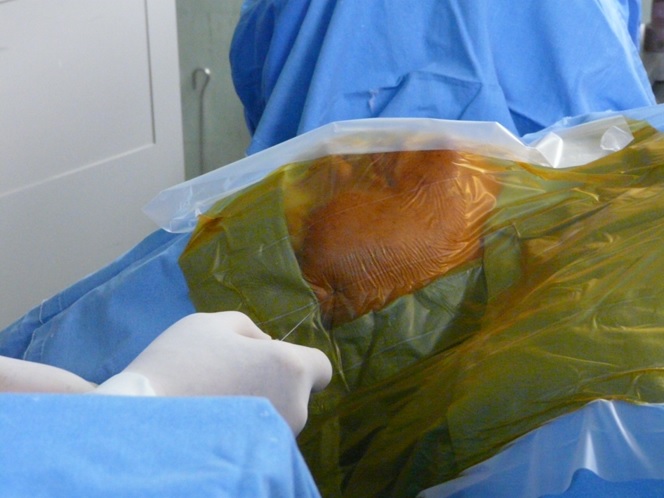 Fig.8. Introduccción de la Crio sonda siguiendo la referencia de la aguja previamente introducida y anestesiado el trayecto hasta la fosa.